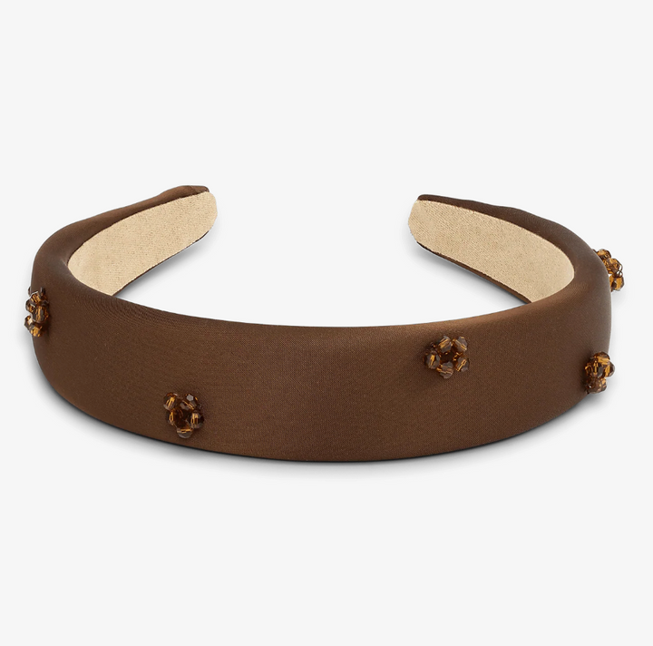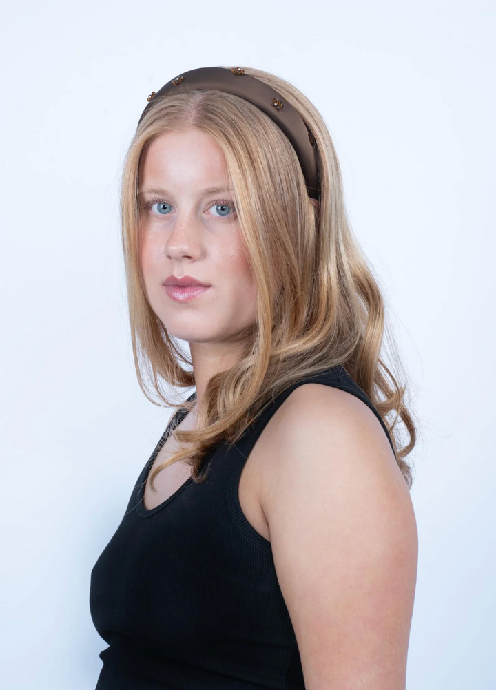 De Floral Gleam Headband is een prachtige haarband in een warme bruine tint, versierd met delicate bloemvormige pareldetails in goudkleurige ambertonen. Het ontwerp combineert klassieke elegantie met decoratieve charme en voegt gemakkelijk een vrouwelijke touch toe aan je outfit.