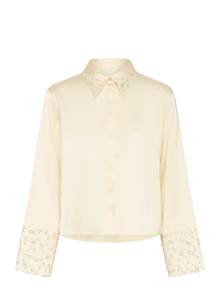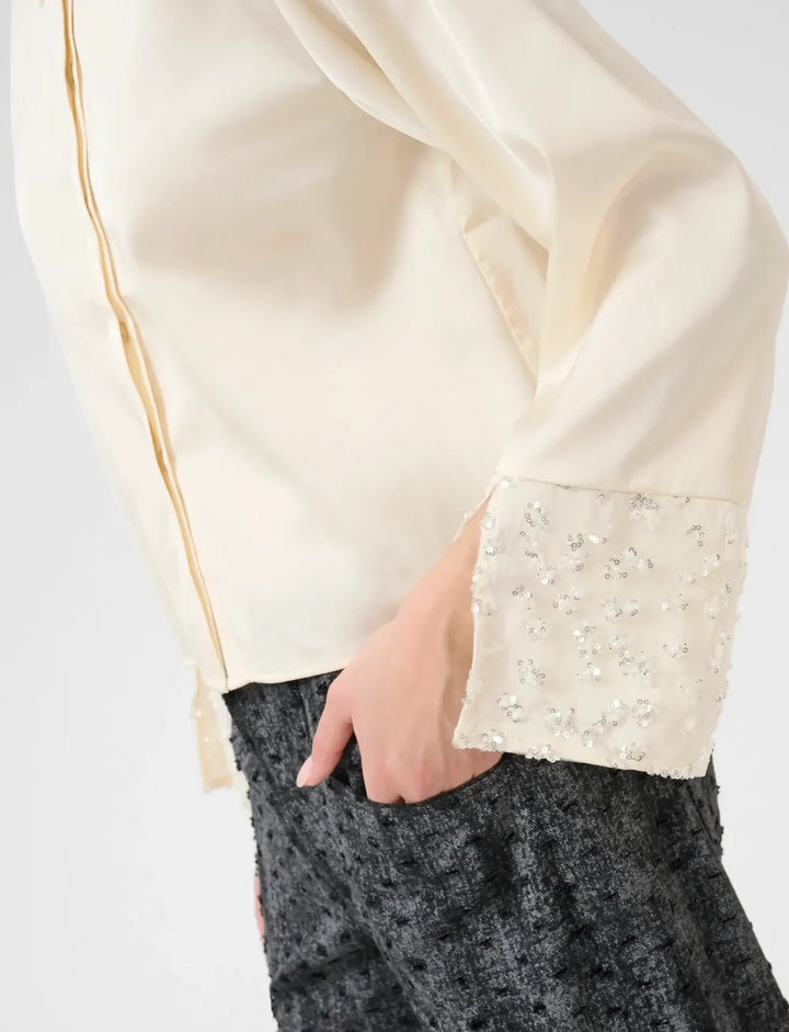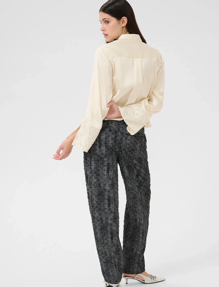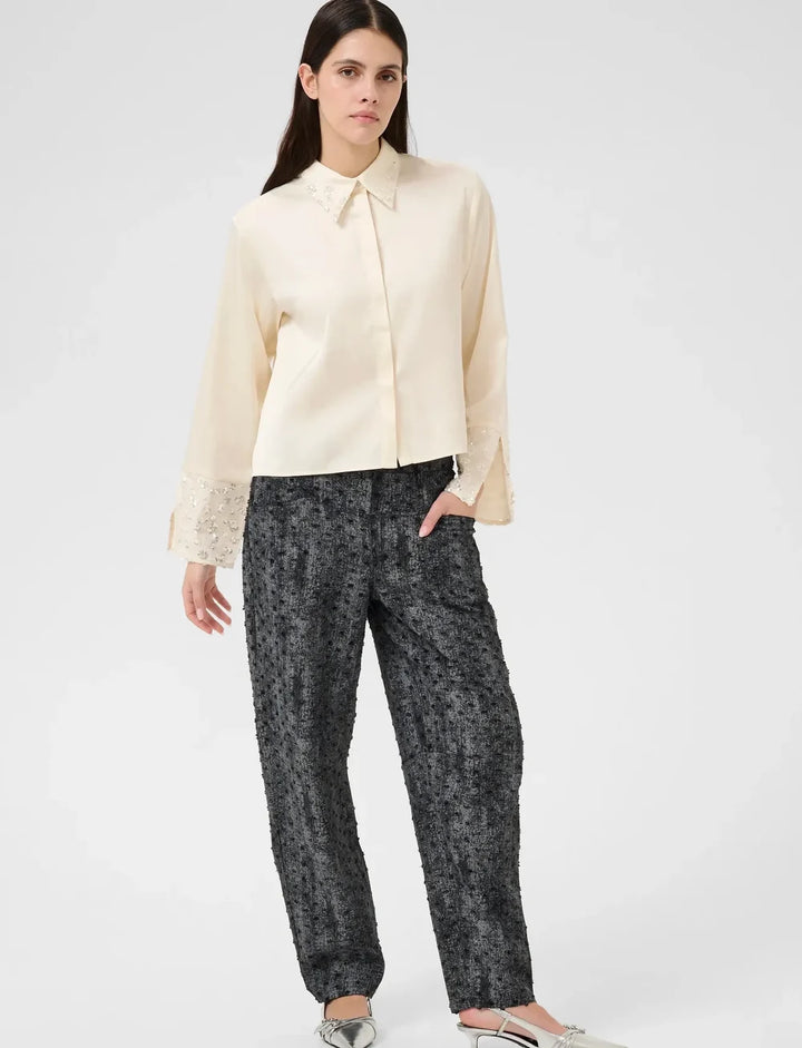 Deze blouse van Karen by Simonsen is het perfecte item om moeiteloos klasse en een vleugje glamour toe te voegen aan je outfit. De lichte stof geeft de blouse een vrouwelijke, elegante uitstraling, terwijl de subtiele glitterdetails op de mouwen en de kraag zorgen voor die feestelijke sparkle.
