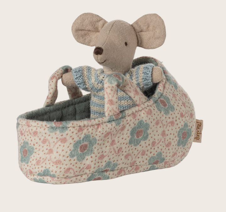 Een kleine babymuis in een zacht, gestreept gebreid pakje. Hij slaapt urenlang in zijn kleine gewatteerde reiswieg.