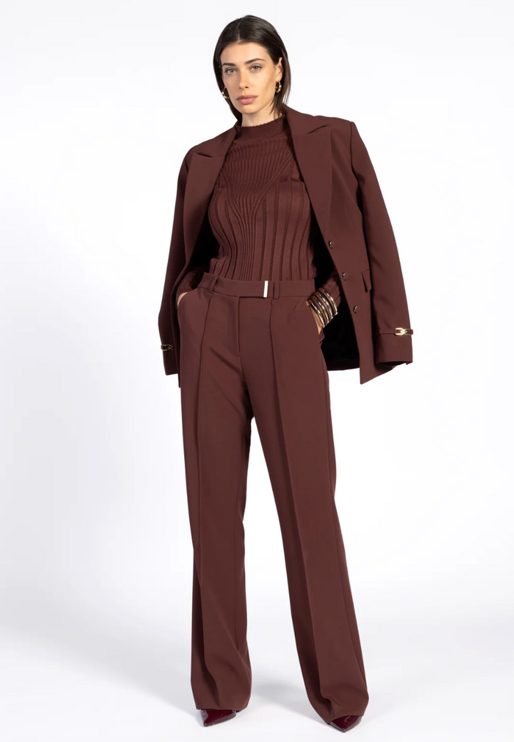 De Chantalle broek is uitgevoerd in een warme bordeaux-tint die meteen een rijke, stijlvolle uitstraling geeft. De rechte pijpen en strakke persvouw creëren een krachtig silhouet, terwijl het goudkleurige gespdetail op de tailleband zorgt voor een subtiel accent. Combineer met bijpassande blazer Emilie.