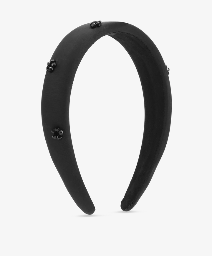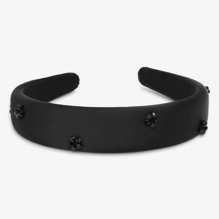 De Floral Gleam Headband is een mooie en eenvoudige zwarte satijnen haarband versierd met kleine bloemvormige kristallen die een subtiele glans aan je haar geven. Perfect voor als je je look wilt opfleuren zonder in te boeten aan comfort.