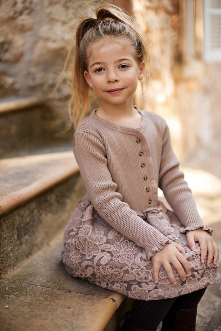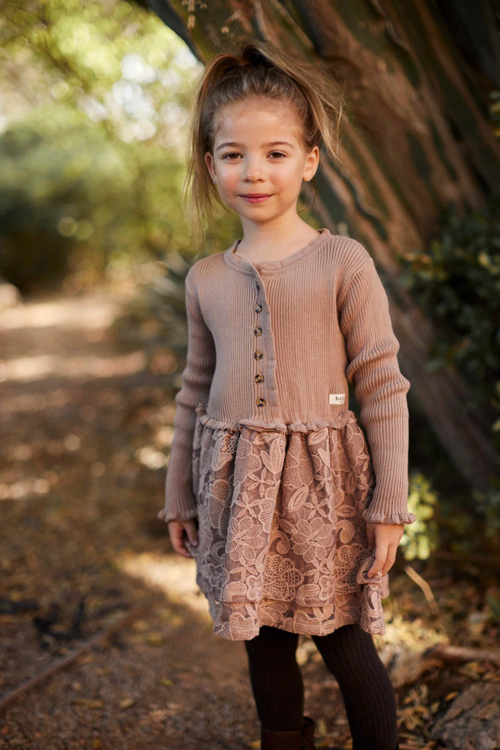 Eyecatcher jurk knitwear met tule De Marieze jurk van Baje Studio is een warme winterfavoriet die elegantie en comfort combineert. Het bovenstuk is gemaakt van zachte rib-knit stof die heerlijk warm en stretchy is, terwijl de volle rok is uitgevoerd in rijkelijk geborduurde tule voor een romantische uitstraling. Dankzij de knoopsluiting aan de voorkant en de verfijnde afwerking is dit jurkje zowel praktisch als stijlvol.