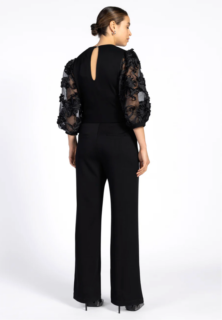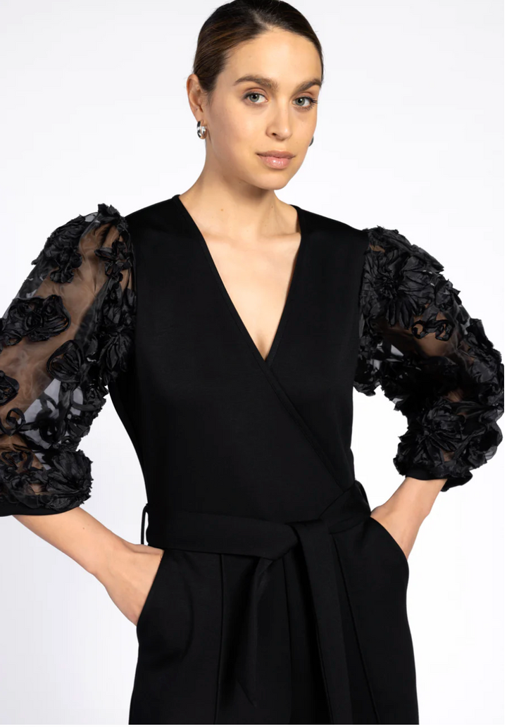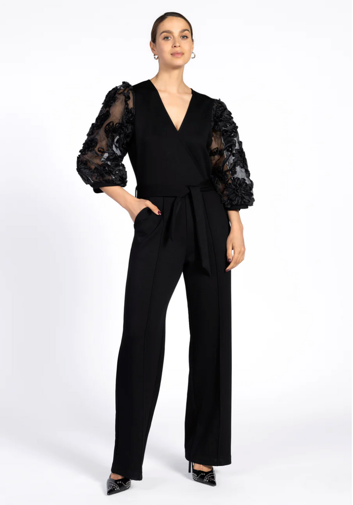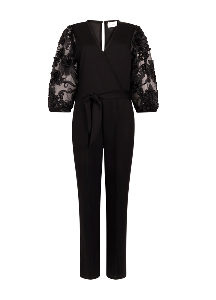 De Lizeth jumpsuit heeft een elegante aangesloten pasvorm met een diepe V-hals en een strikceintuur die het silhouet accentueert. De absolute blikvanger zijn de volumineuze, transparante mouwen van organza, rijkelijk versierd met bloemenapplicaties in ton-sur-ton zwart. De rechte pijpen zorgen voor een tijdloos en flatterend silhouet, terwijl het materiaal zorgt voor draagcomfort en een luxe uitstraling.