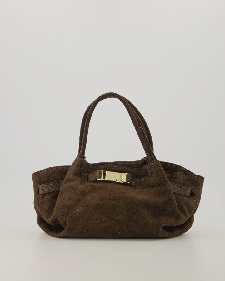 Deze tas is van echt suéde en handgemaakt in Italië. Er zit een hengsel bij zodat je hem ook crossbody kan dragen.